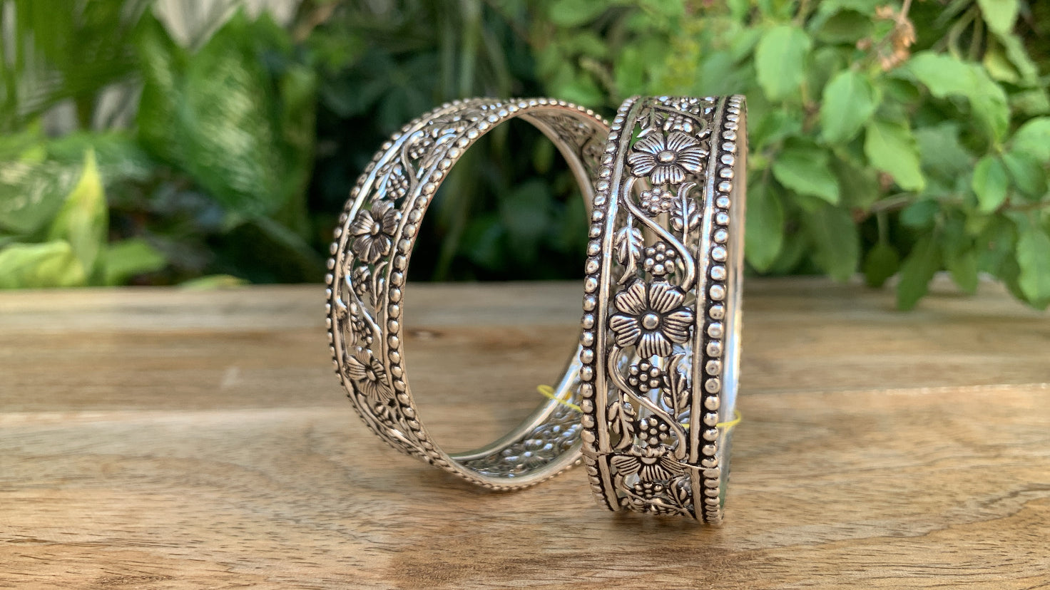 Vintage Oxidised Silver Floral Bangles for Women | Handcrafted Ethnic Kada | 925 Pure Silver